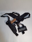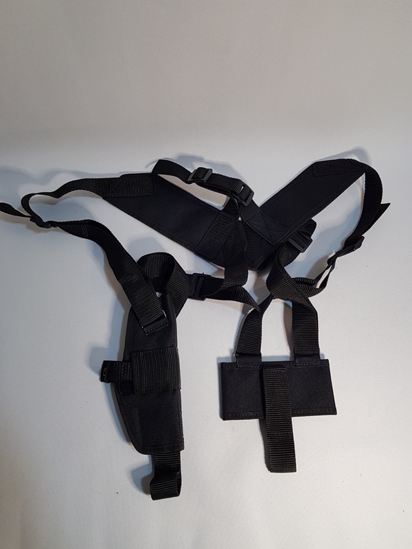 Ptp anyagból készült válltáska Parabellum típusú fegyverhez. Egyik oldalán a pisztolytokkal másik oldalon tartalék tártokkal,állítható, tépőzárral az övre rögzíthető függőleges kivitelben.